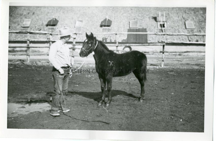 B&W glossy print: man showing a young horse in corral, horse is branded