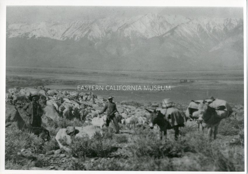 B&W glossy print: 2 sheepherders with their flock & 2 burros loaded with supplies