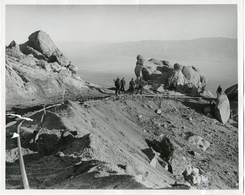 Forest Service Personnel survey the work done by the Civilian Conservation Corps men along the Whitney Portal Road. The Dept. of Army supervised the CCC camp and provided logistics for the camp. Inyo National Forest personnel supervised the crews working on the road each day and returned them to camp each night.