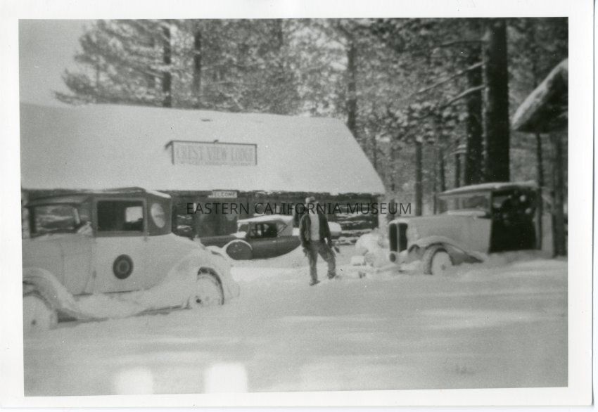 B&W matte print: man walking through snow in front of Crestview Lodge, early model cars