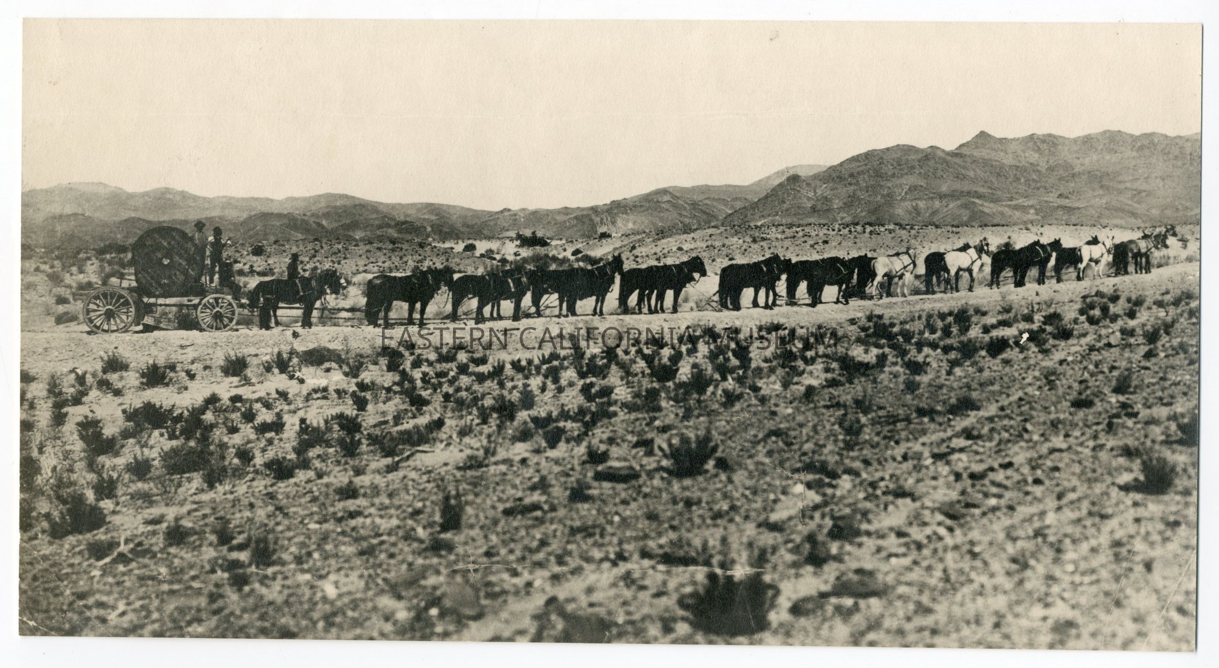 Enlargement of photo A856.1: Photo taken November 1908 of a 24 animal team hauling cable to Cerro Gordo Mines via the Yellow Grade Road. Photo taken by Jim Wheeler.Collection