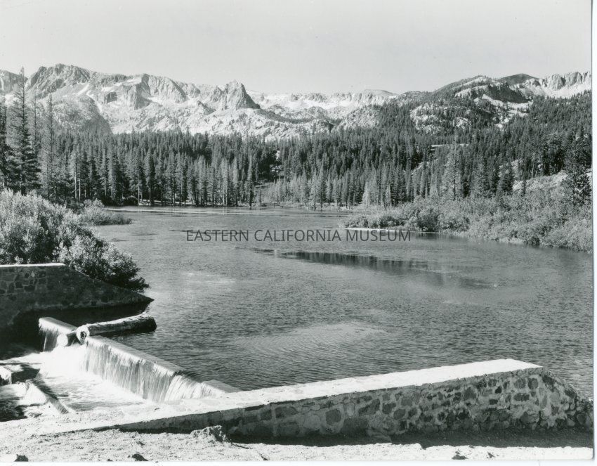B&W glossy print: outlet of lower Twin Lake with Crystal Crag in background