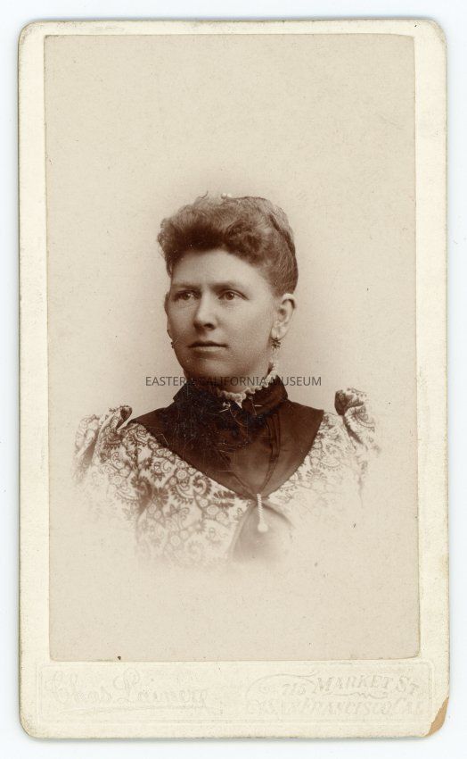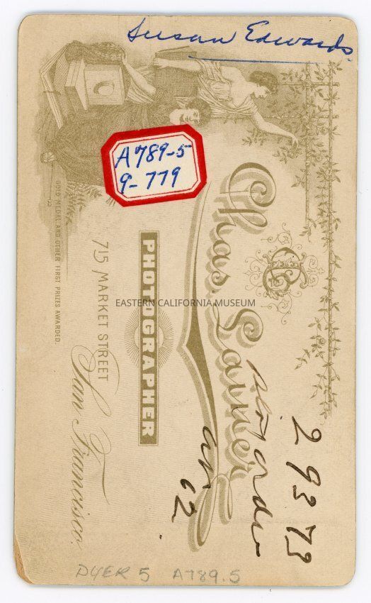 Small photograph affixed to card of Susan Edwards. Writing on reverse in black ink includes "2 93 73" and something illegible. Photo by Chas. Lainer of San Francisco. The card is highly decorated on the reverse.