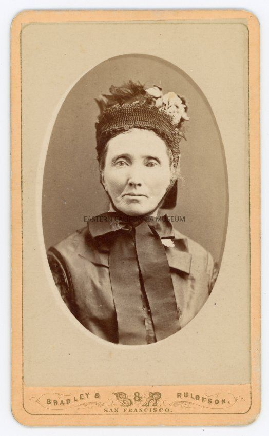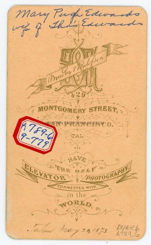 Small photograph affixed to card of Mary Pugh Edwards, wife of Thomas Edwards. It was taken on May 20, 1873. Photo by Bradley and Rulofson of San Francisco. The card is highly decorated on the reverse.Made/Created