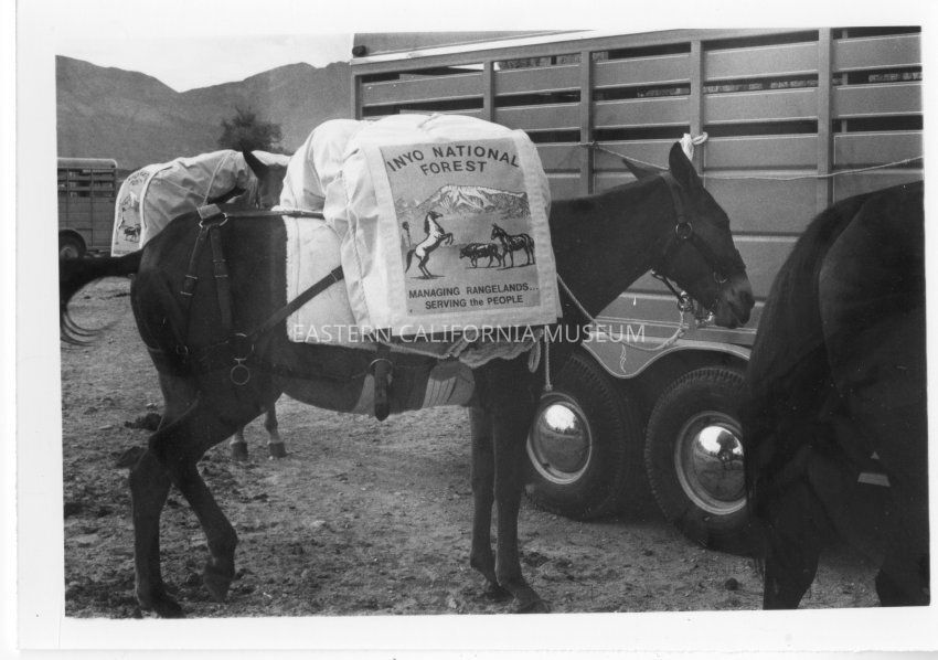 B&W matte print: pack mule with panier sign " Inyo National Forest Managing Rangelands Serving the People"