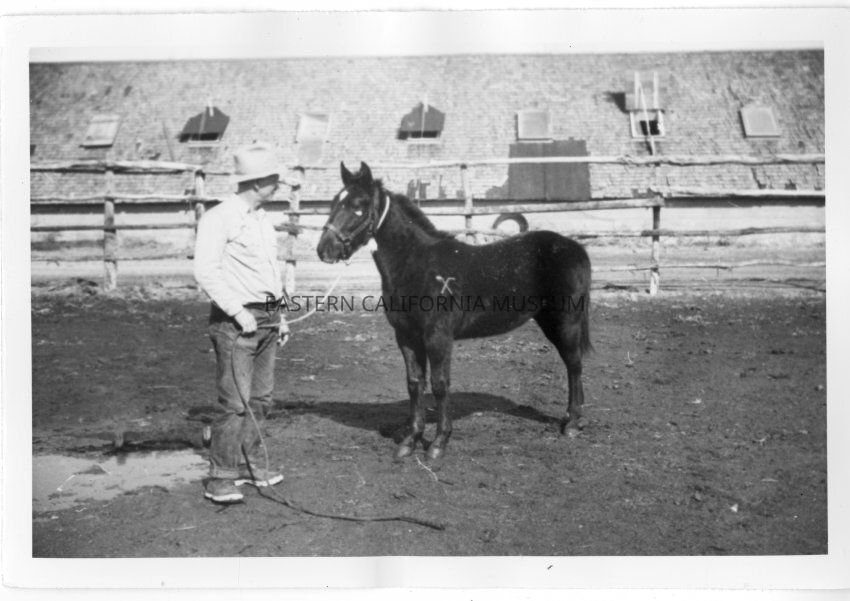 B&W glossy print: appears to be a man showing a horse inside a corral