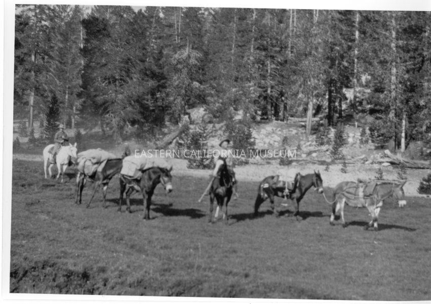 B&W glossy print: several pack animals and 2 wranglers on horseback