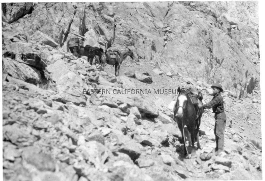 B&W glossy print: man cinching his saddle along a rocky trail; other pack animals in background