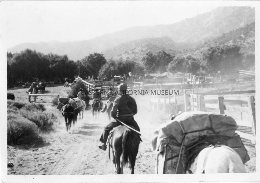 B&W glossy print: appears to be a pack train leaving the pack station, several pack animals, corrals