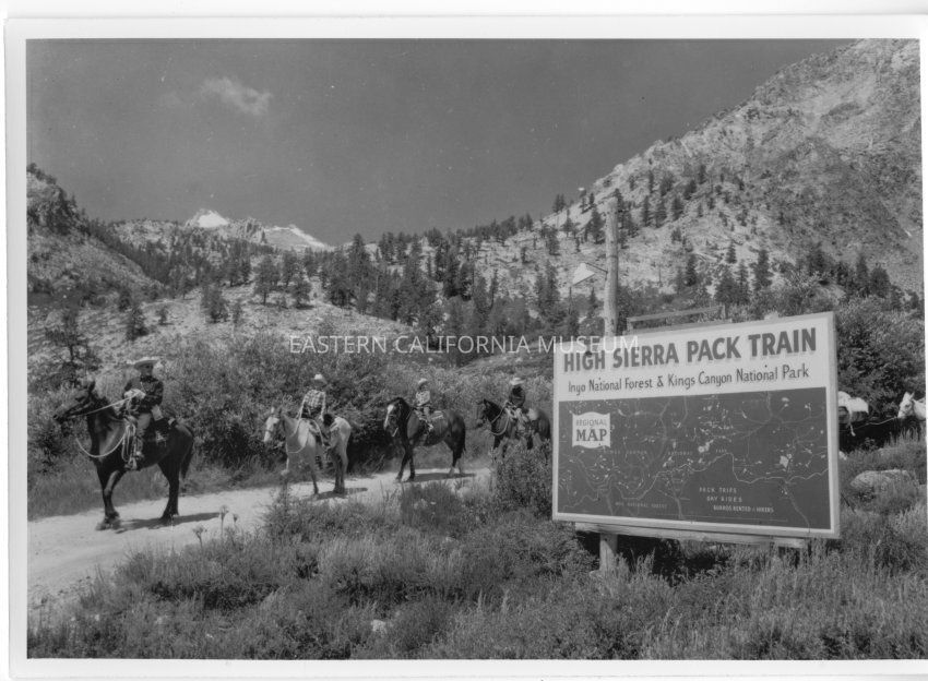 B&W glossy print: pack train leaving pack station with forest service/park service sign