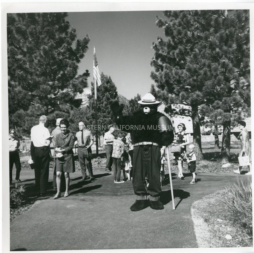 B&W glossy print: Smokey the Bear, waving to the crowd for the dedication ceremony