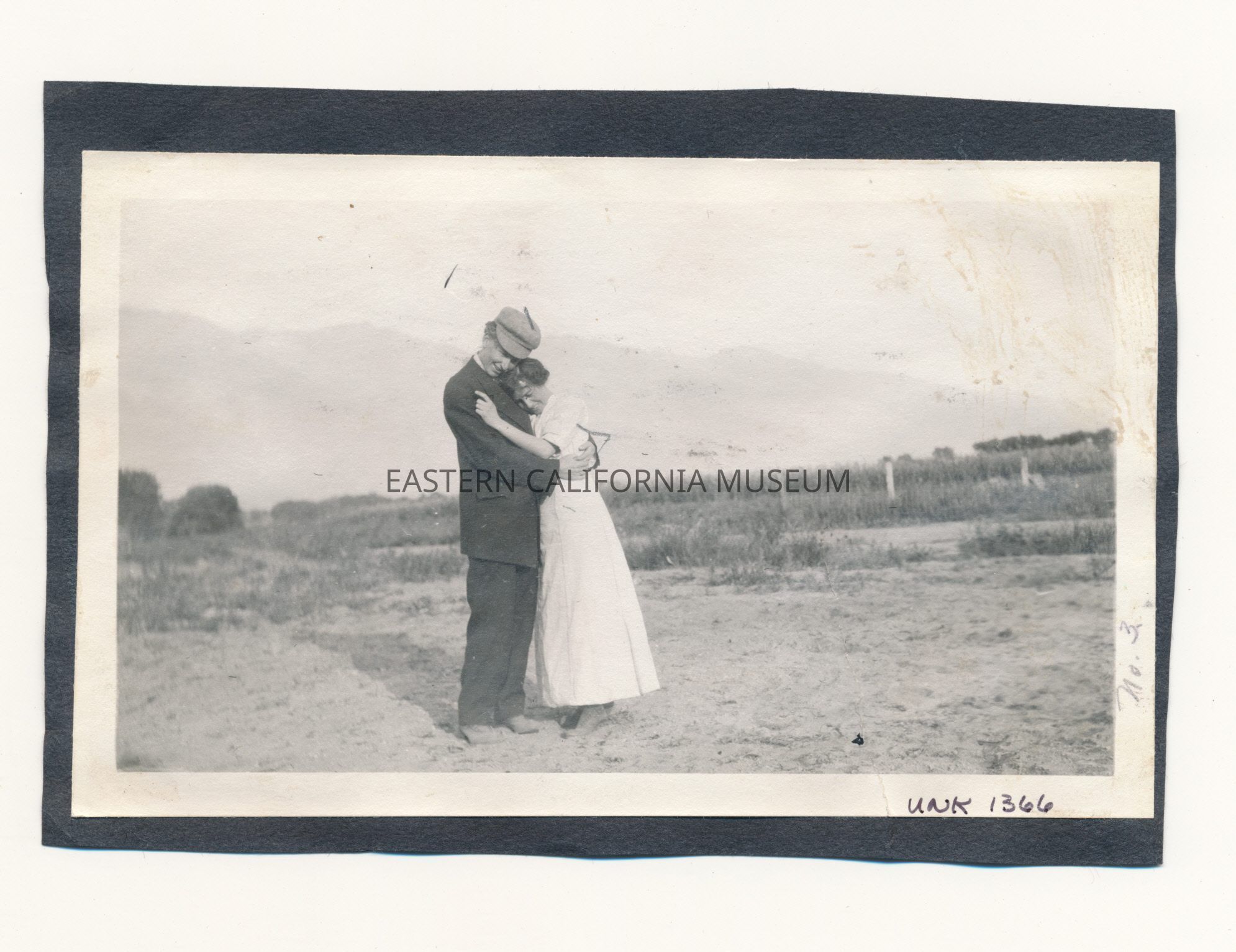 Photo of two people embracing. While they appear to be a man and woman, it is possible the person in the dark suit is a woman dressed in men's clothing. The location may be the Manzanar area.