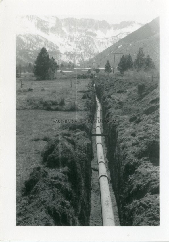 B&W glossy print: ditch with pipe, snowy mountains in background