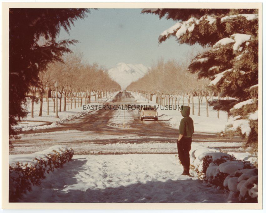 Color print of a road and snowy landscape. There are one or two vehicles in the road and a person wearing a hooded top standing with his back to the camera.Collection
