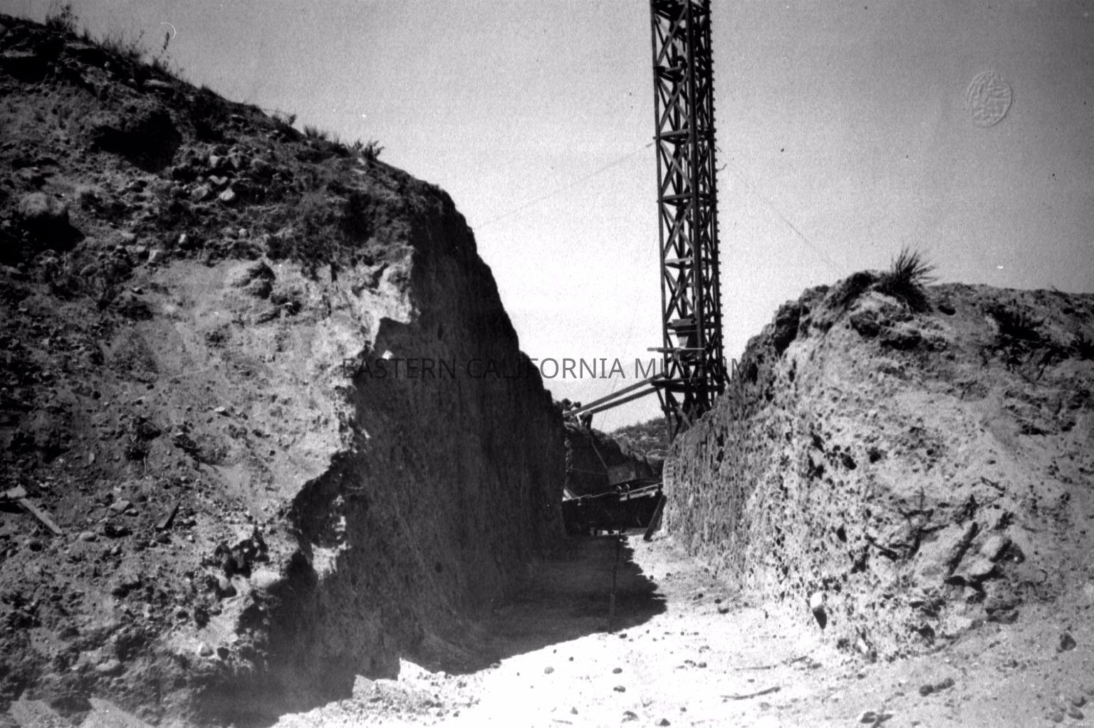 B & W digital scan of Machinery possibly a Crane or Piledriver at the end of Trench on LA Aqueduct Project.