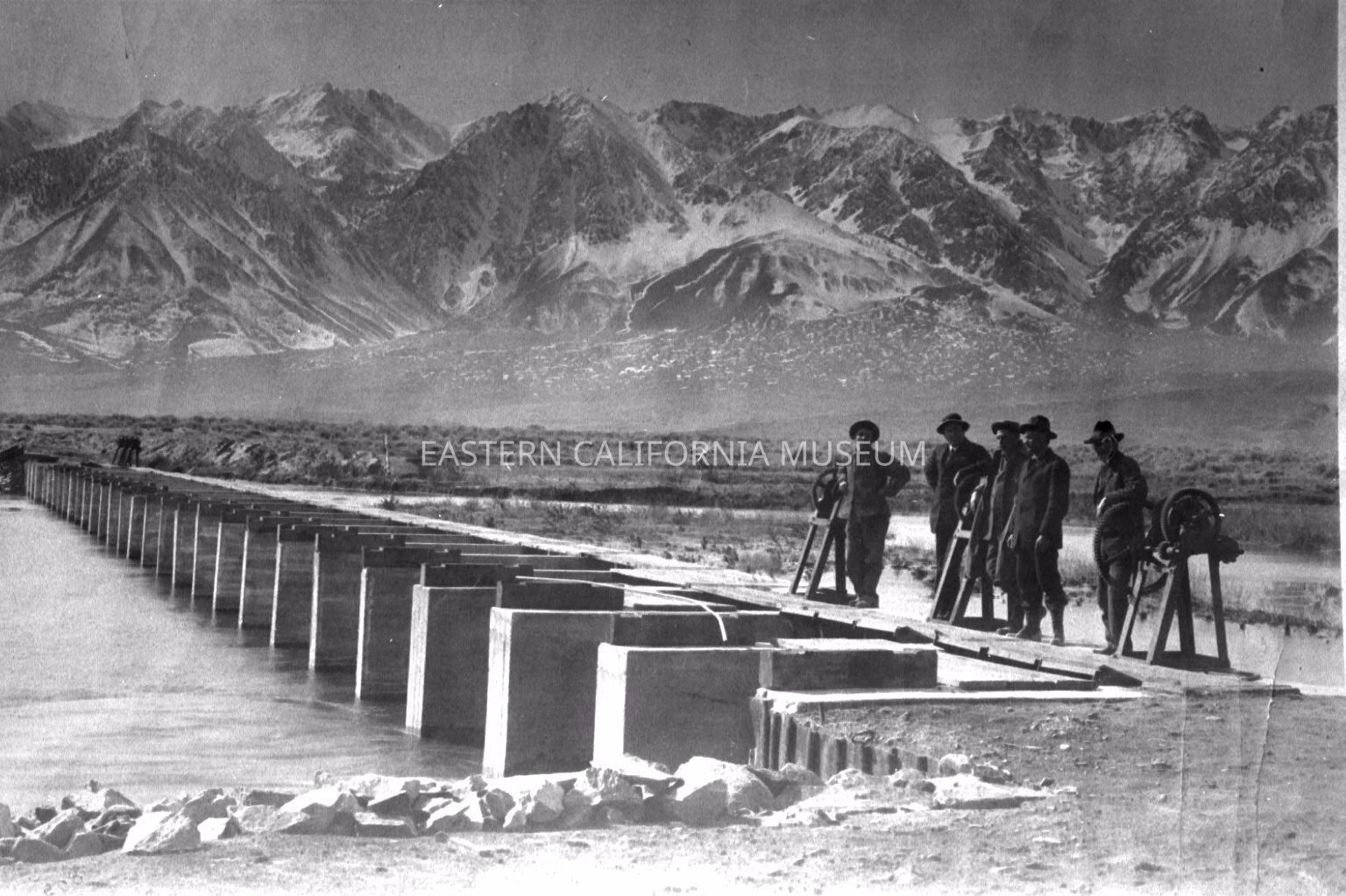 B & W digital scan of Men at Radial Control Gates of LA Aqueduct Diversion Weir still under construction. Other set of three gates visible in left center of image. Water continues to flow through structure. Looking from east to west toward Sierra Nevada. "Between the two sets of Radial Gates are 240' of Owerflow Weir. The Weir constists of a reinfoced concrete apron upon which are built concrete abutments supporting vertical reinforced concrete walls." from LA Aqueduct Construction, Final Report, 1916, pg 131.Collection