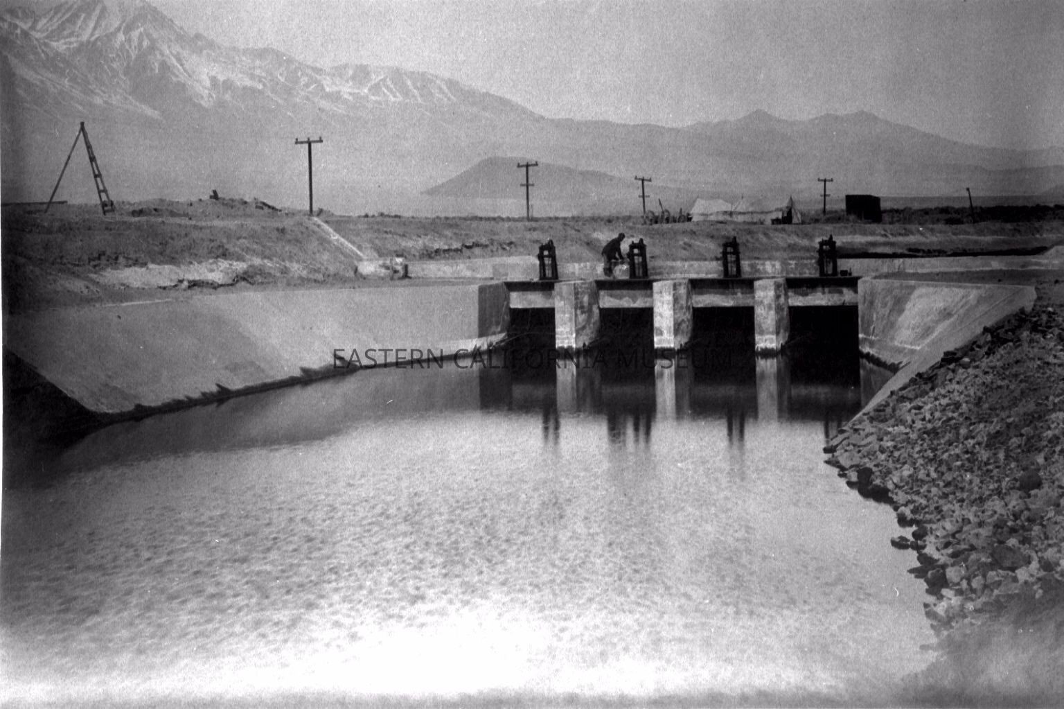 B & W digital scan of LA Aqueduct Intake showing the four Control Gates that regulate the flow into the Unlined Canal Section of the Aqueduct. "These are also of the radial type, 8' wide and 7' high. All of these gates were built at Aqueduct shops. They work satisfactorily and are tight. The total cost of the headworks complete, including the canal regulating gates was $63,447.68. From, LA Aqueduct Construction, Final Report, pg. 131Collection