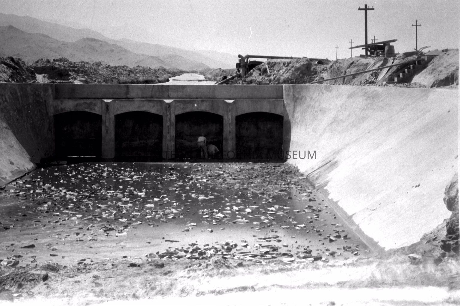 B & W digital scan of LADWP Laborers working on LA Aqueduct Intake Control Gates. Four Valves controlling gates yet to be installed. Water impounded behind the Gates visible in upper middle of image. Looking from downstream side north.Collection