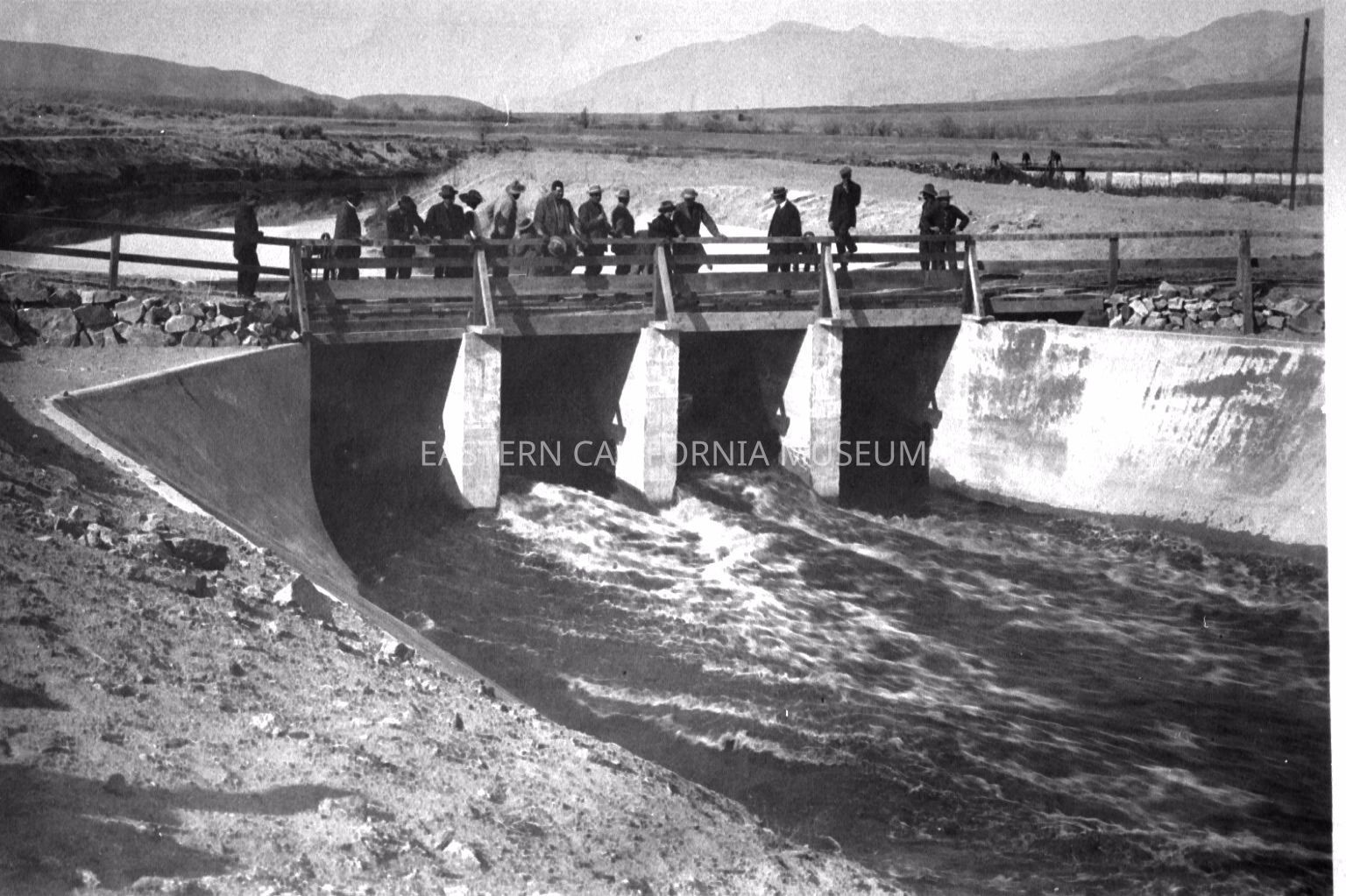 B & W digital scan of Christening Party, consisting of Top Brass of LA Aqueduct Project watching Owens River Water flowing through Intake Gates on its 233 mile journey to Los Angeles. Control Gates and Diversion Weir structure visible in upper right corner. Looking upstream or north toward Inyo Mountains.Collection