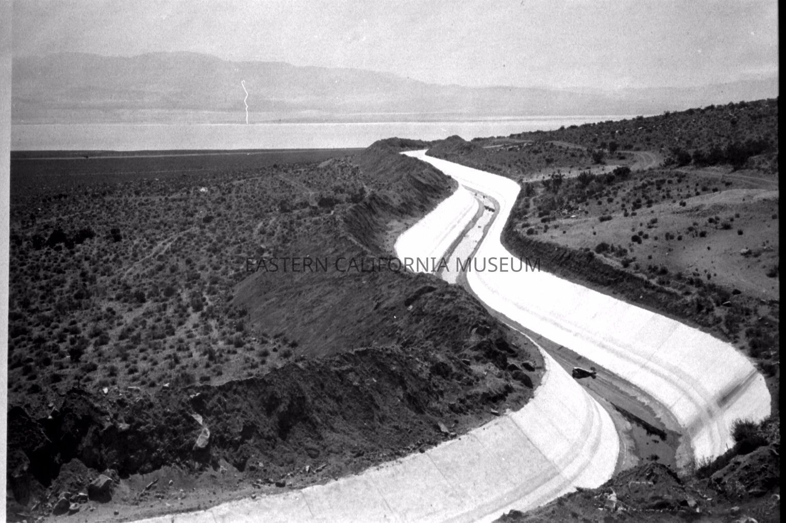 B & W digital scan of Lined Section of Los Angeles Aqueduct snaking through foothills west of Owens Lake. Given the trickle of water in the aqueduct, this image may have been taken before the Aqueduct was officially operating. Note berms of earth along leftside of Aqueduct. Looking west to Owens Lake and Coso Mountains.Collection