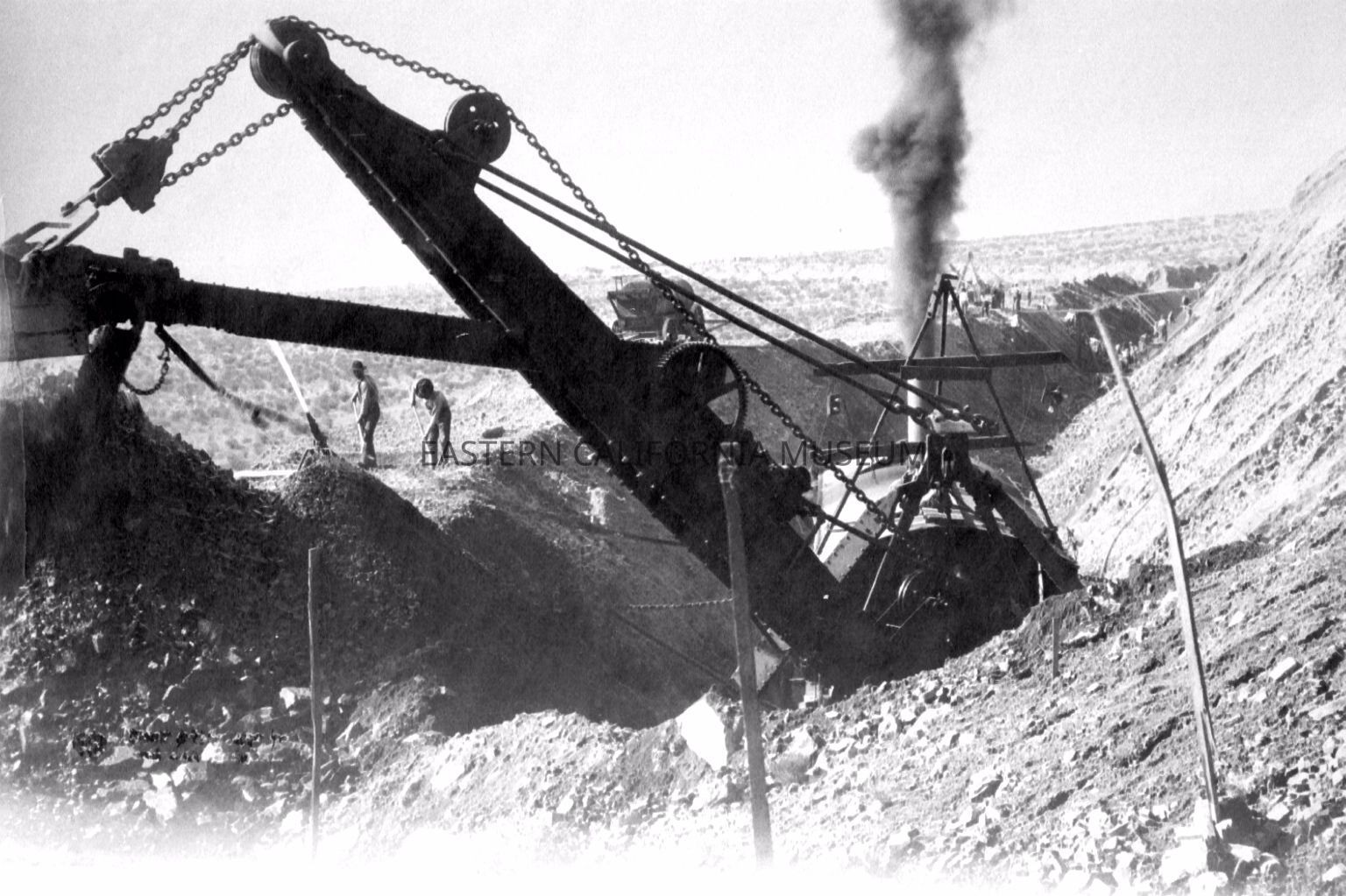 B & W digital scan of LADWP Steam Shovel excavating ditch for Lined Section of the LA Aqueduct, location somewhere between Alabama Gates and Haiwee Resevoir. "The shovels were standardized, the Model 40 Marions being used on the standard 430 second foot conduits and the Model 60's on the larger open lined conduits in the Owens Valley. A large suppy of repair parts was kept on hand, and within a few hours after any breakdown it was possible to have the parts on the job and usully within 24 hours any ordinary repair could be made. Well-equipped machine shops were maintained on every division. To avoid delay to the concrete work, the excavation was maintained 500 ft. in advance." -- from LA Aqueduct Construction, Final Report, 1916 pg. 174.Collection