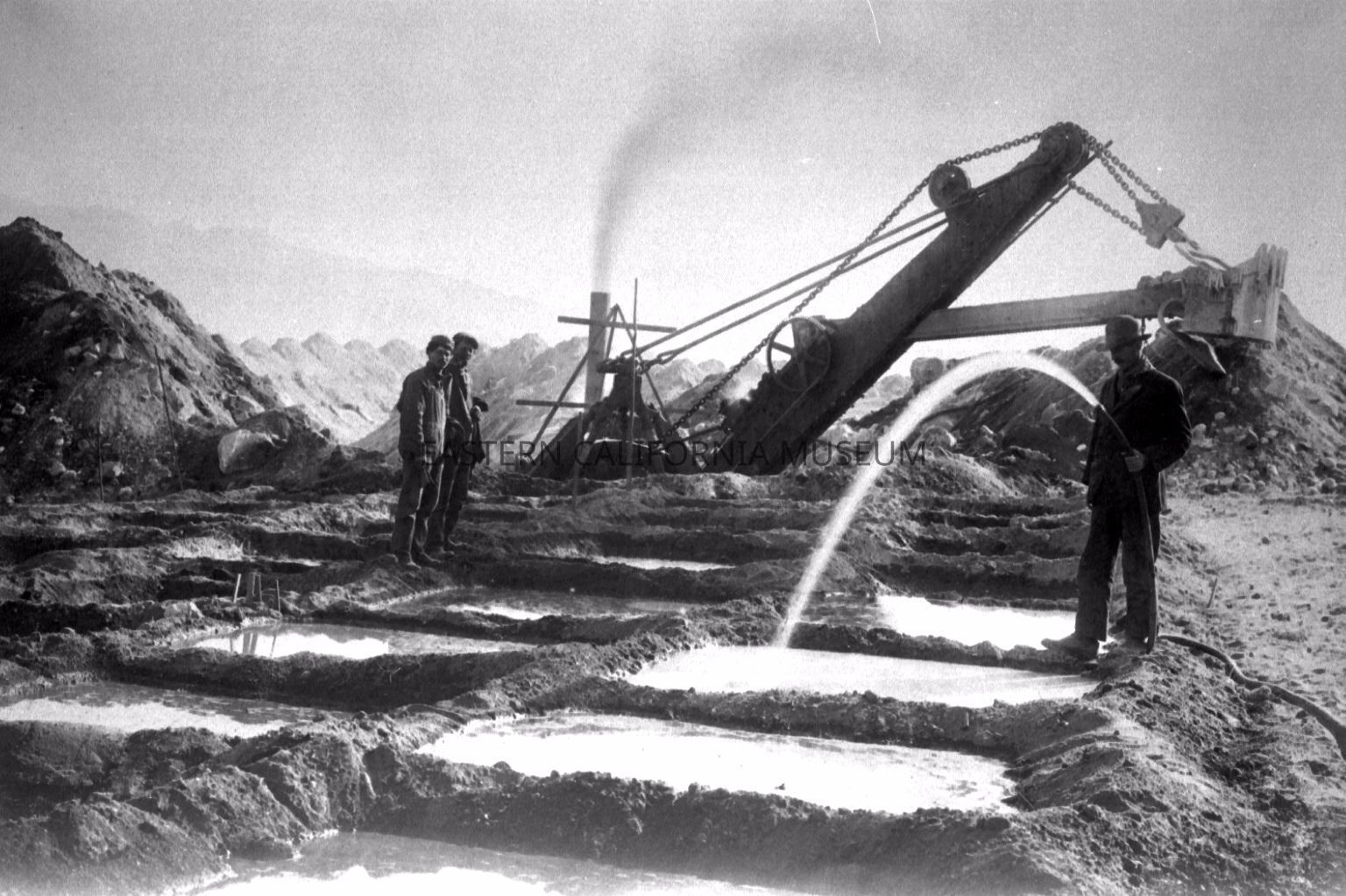 B & W digital scan of LADWP Laborers wetting down Soil in Advance of Steam Shovel Excavation. The small percolation ponds saturate the well-draining soil and facilitate a greater ease of digging? Note, the pyramids of earth formed by this behemoth in the background. Looking east to the Inyo Mountains.Collection