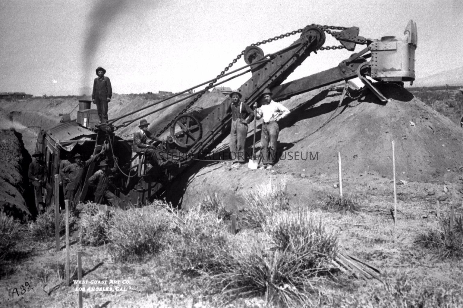 B & W digital scan of LADWP Steam Shovel Crew numbering seven men, location unknown. Note the survey sticks marking the area to be excavated by the shovel crew. Uncertain as to the fuel used to fire the boiler in the shovel.Collection