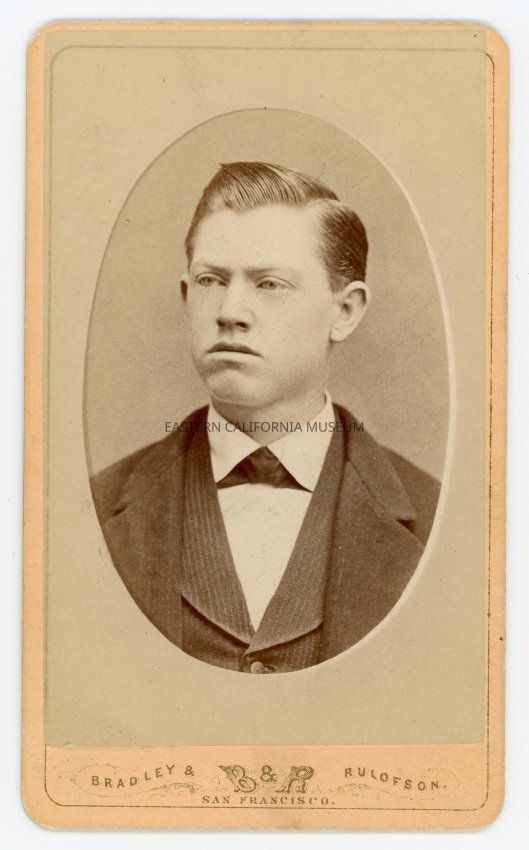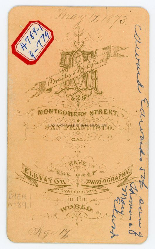 Small mounted studio portrait of Edward Edwards, the 5th son of Thomas and Mary Edwards. The photo was taken on May 19, 1873 when he was age 19. The photographer was Bradley and Rulofson of San Francisco.Made/Created