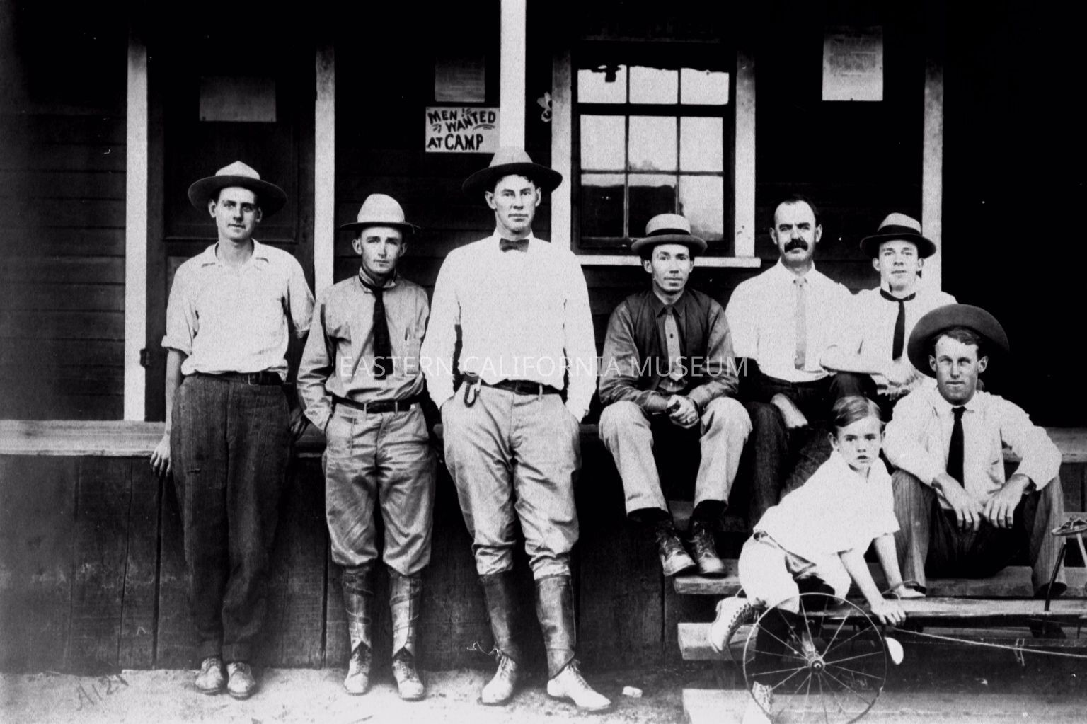 B & W digital scan of Men and child in front of Aqueduct Construction Camp building. Based on clothing they may upper echelon LADWP employees. Note boot covers on second and third men from left. Sign in upper middle of image reads, "Men Wanted in Camp."Collection