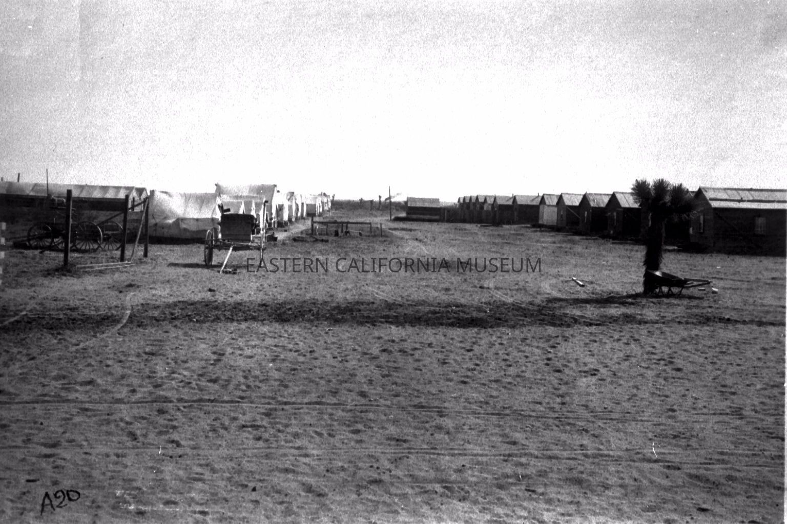 B & W digital scan of typical LA Aqueduct Construction Camp in Mojave Desert. 3500 men were maintained in these camps during building of the Aqueduct. Two types of housing visible in image. Tent buildings on left and Bunk Houses on right.Collection