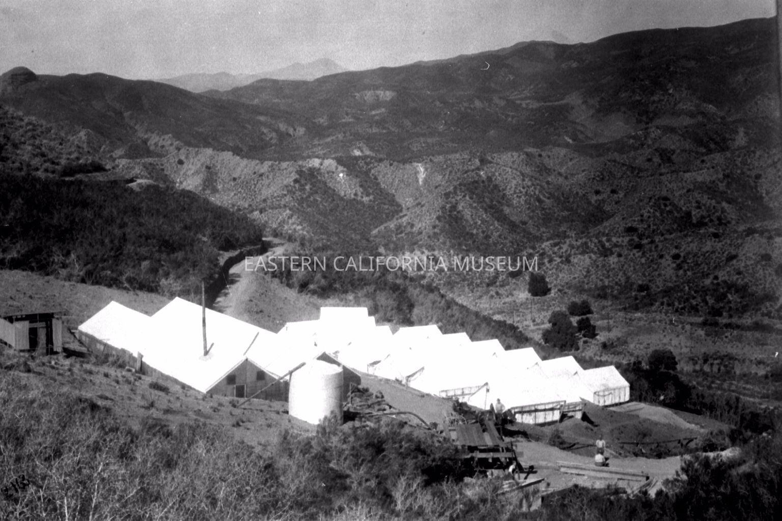 B & W digital scan of LA Aqueduct Construction Camp. White tent cabins housed laborers. Double barrack served as Mess House. White Water tank visible in image provided water for camp. Horse drawn wagon and men in lower right corner. Chapparal covered mountains suggest this camp may be located in the Soledad Canyon, Santa Clarita area.Collection
