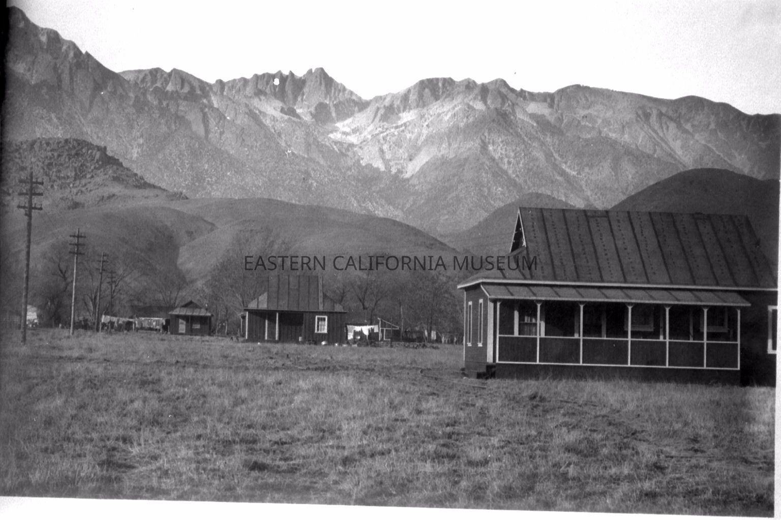 B & W digital scan of LADWP's Olancha Division Headquarters, LA Aqueduct Construction Project, Lone Pine. Location possibly between Whitney Portal Road and Tuttle Creek Rd. Residences are quite substantial and are likely Engineers Housing. "Four-room dwellings were erected for the Division Engineers, who paid a monthly rnet to the City sufficient to return the investment. These dwellings each cost from $600.00 to $900.00 depending upon the location and cost of hauling the material." from LA Aqueduct Construction, Final Report, 1916, pg. 89. Mt Whitney near upper center of image.Collection