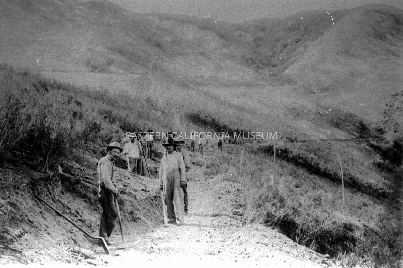 B & W digital scan of LADWP Road Building Crew creating access roads for Construction of LA Aqueduct, location possibly along base of Southern Sierra.Collection