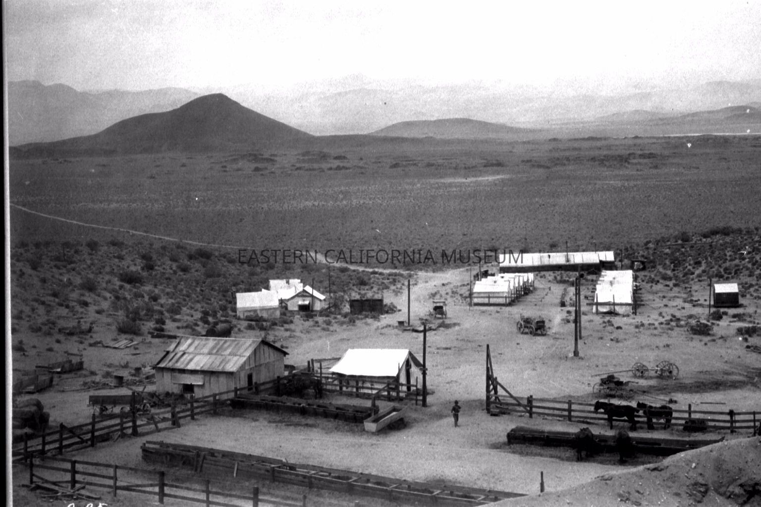 B & W digital scan of LA Aqueduct Construction Camp, east of Fossil Falls and Coso Mountains, Little Lake Division. Tent Cabins, Mess Hall (long white structures) Corrals and Troughs are visible in the image. Cinder Cone in upper left of print.Collection
