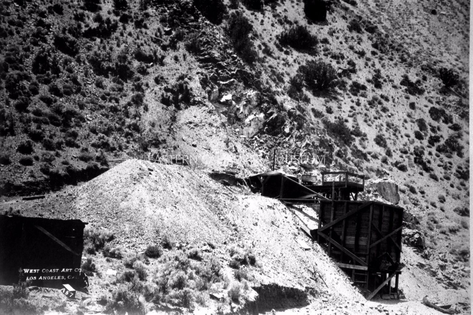 B & W digital scan of Mining Operation generating material possibly for the manufacture of cement for LA Aqueduct Project. Note; Tailing Pile and Ore Bin.Collection