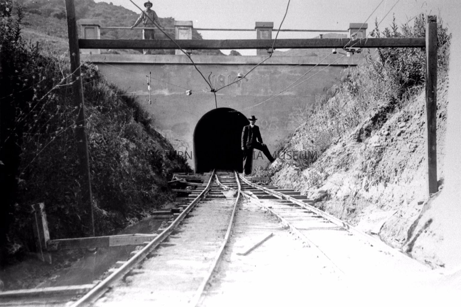 B & W digital scan of man standing in front of unidentified tunnel entrance on LA Aqueduct? Date in concrete above Tunnel reads 1914, which places it after completion of the Aqueduct. Wiring above tunnel operated an Electric Locomotive. This tunnel may have operated as infrastructure for Aqueduct.Collection