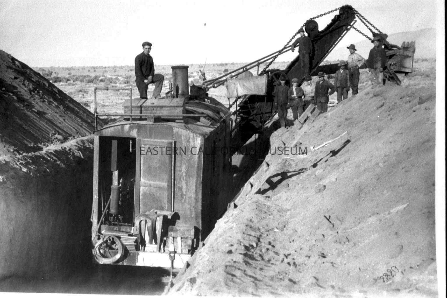 B & W digital scan of LADWP Crew operating Marion 40 Steam Shovel excavating trench for LA Aqueduct Covered Conduit section, Mojave Desert. Note ladder resting against trench in center of image allowing men access to the shovel. "The standard type of desert conduit differs from that originally proposed by the Board of Consulting Engineers in that it is covered and the bottom flatter. With the bottom sharply curved, the expense of trimming after the shovel and forming would be considerable." LA Aqueduct Construction, Final Report, 1916, pg 173Collection