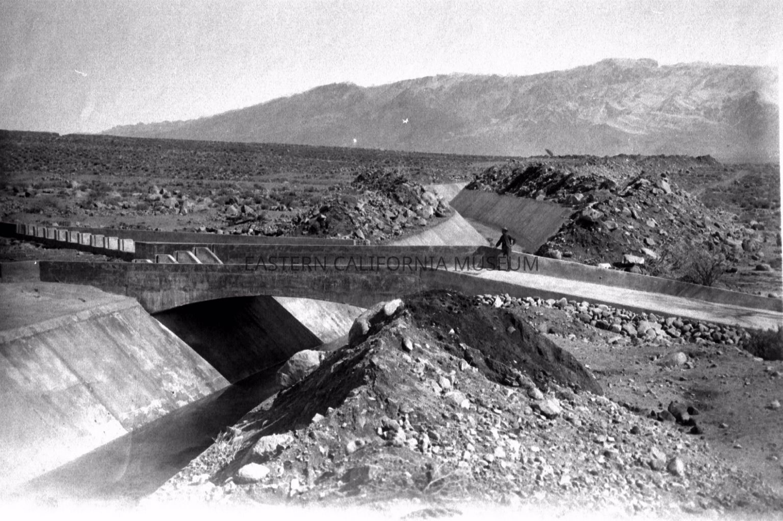 B & W digital scan of Cottonwood Creek Flume crossing the LA Aqueduct. Looking south toward Olancha. "Much has been done to provide for the safe delivery of the water from these side streams over and into the Aqueduct, and to prevent the overtopping of the walss bvy any sudden rise in the water level in the Aqueduct itself. At Cottonwood Creek an arch crossing for flood waters was built, and weirs were constructed so that this large creek can either be taken into the Aqueduct or passed on down the stream channel. Precautions have been taken for the eliminating the sand and gravel from the water before it enters the ditch. Just south of this structure a standard waste-way was constructed, which permits the turning all the water from the Aqueduct into the channel of the Cottonwood Creek, if desired.Collection