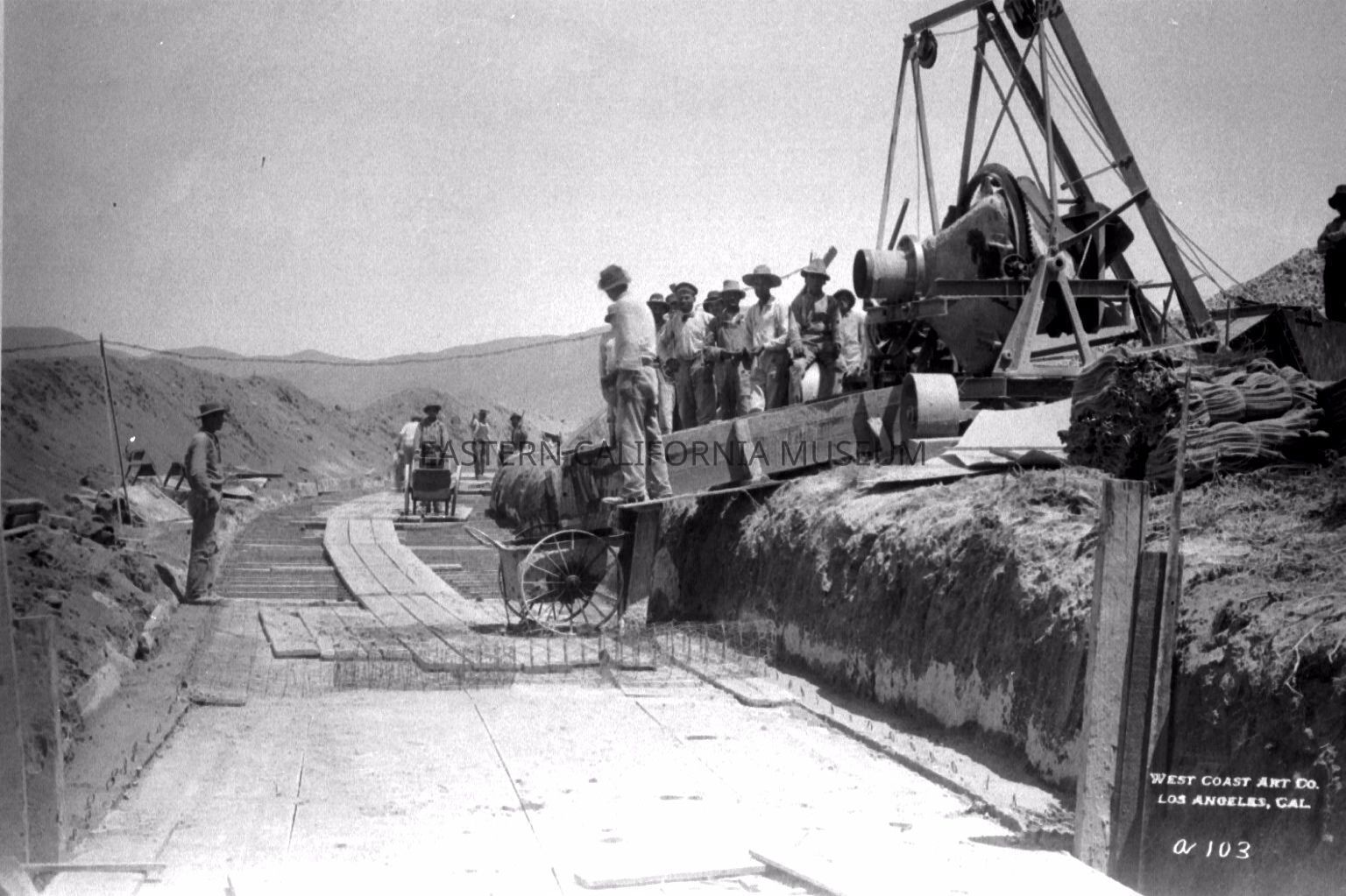 B & W digital scan of LA Aqueduct Workmen covering Conduit with concrete roof. Mojave Desert / Antelope Valley. Note; Batch Mixer, Flume, and Cement Carts visible on right of image.Collection