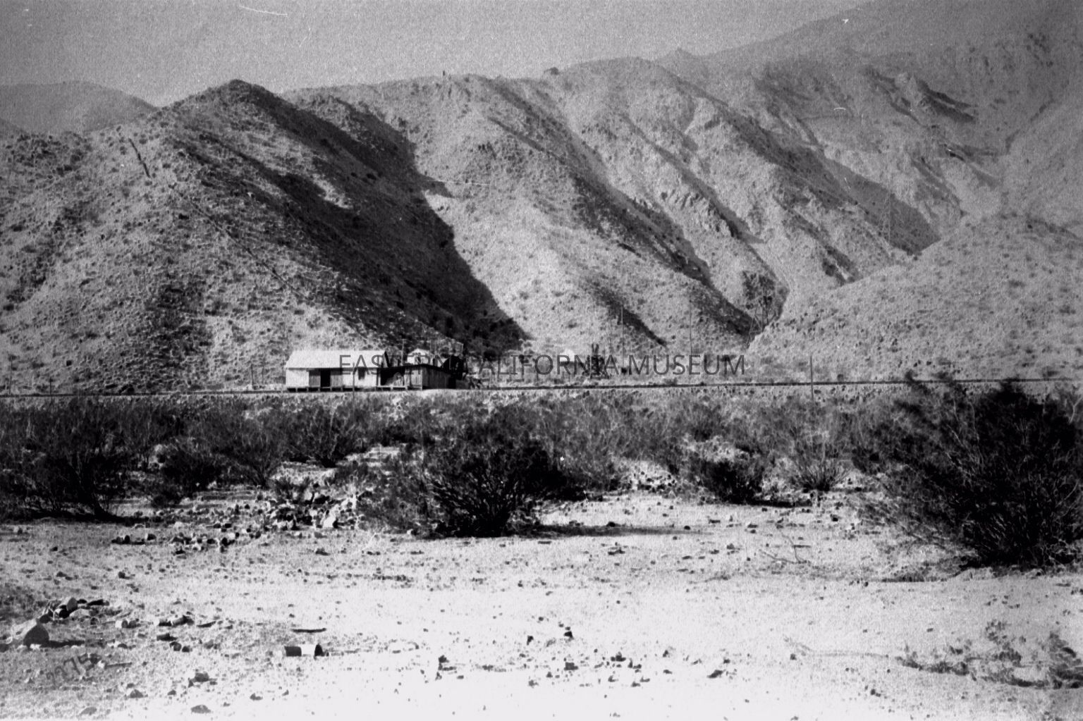 B & W digital scan of LA Aqueduct camp structure (warehouse / Compressor Plant) next to Rail Siding? Location; Mojave Desert. Transmission Lines or Tram Towers feeding down to structure visible on right side of image.Collection