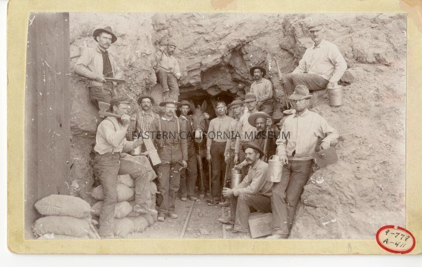 Mounted photo of miners posing in front of a mine shaft at the Reward Mine, circa 1894.