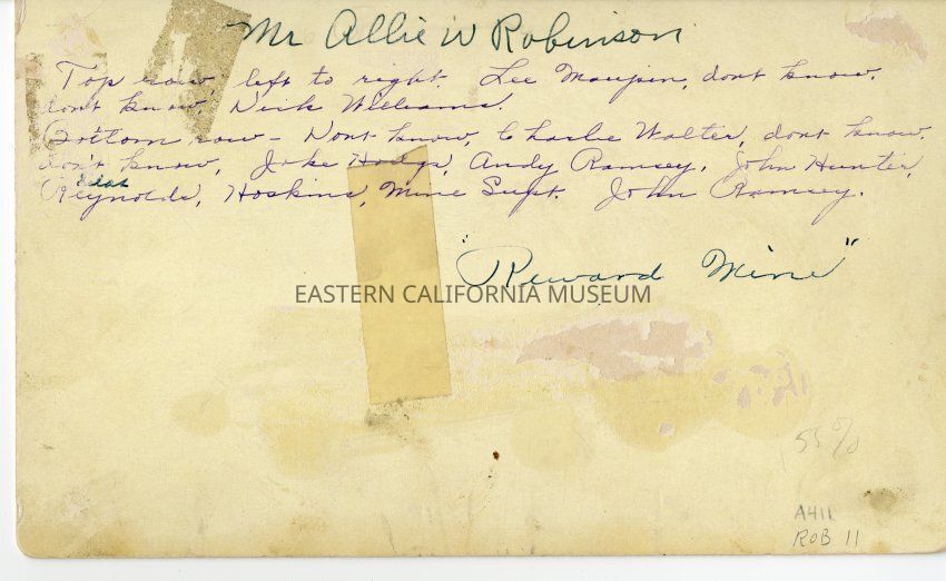 Written in pen on reverse: Mr. Allie W. Robinson, Reward Mine.