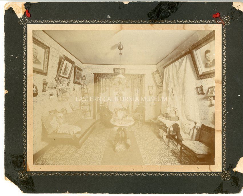 Mounted photo of the interior of what has been identified as the Robinson house in Independence. There is a red ribbon poked through the mounting and knotted to create a way to hang the photo. Visible in the photo are several photographs and pictures hanging in large frames, a sofa, chairs, table, wallpaper, window with tasseled swag, lace curtains, knick-knacks, large ornate light fixture, and two unidentified people sitting in chairs in front of window.