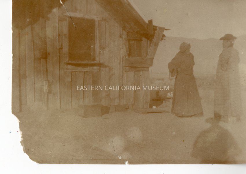 Photo of Mrs. Thibault, a French woman, and Mrs. Chas Robinson (Allie's grandmother) standing next to a rough wood cabin. Photo is faded, but you can see the photographer's shadow at the bottom.