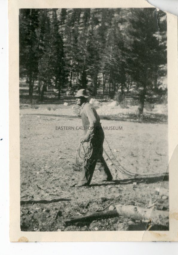 Handwritten in pencil on reverse: Vedette Meadows. H. D. Gill, father of Lizzie Carrasco [illegible] Gill. One of the finest ropers in country. Taken on Sierra Club trip with Allie Robinson.