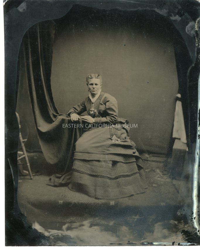 Tintype of Mrs. Chas Robinson posing in a studio. Damaged around edges, but center is clear. Additional information from the accession record: Large tintype of Mrs. Robinson, Allie's Grandmother. Later married Mr. Houle.Photograph Details