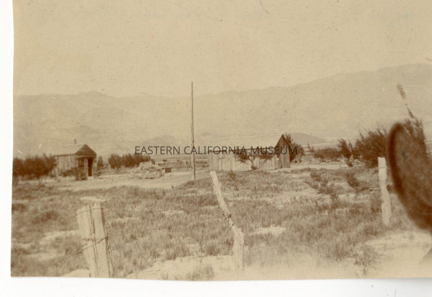 Photo is taken facing east, with the Inyo Mountains in the background. Two wooden structures, a wood and barbed wire fence, tall vertical pole in the center. There is a fuzzy horse's ear in the right hand side of the shot.