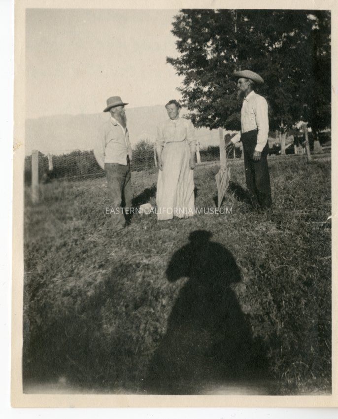 Written in blue ink on reverse: From left to right: Perry McConell (old timer--ask Pete Mairs or Nettie Fausell), Mrs. (A. W. Robinson)Hull [Houle?], Charley Hull [Houle?].Collection