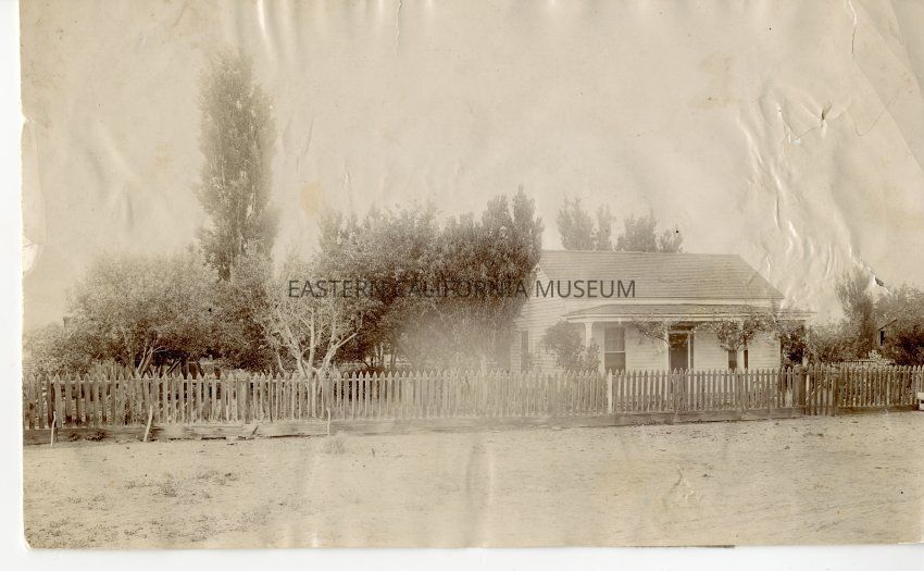 Photo of a nice house, fence, trees, and dirt road. It has been cut out of a photo album, and on the reverse side of the album page is a single photo of a face that someone had tried to rip out. Information from the accession record: Picture of the Stubblefield house. This house was in the middle of the block across North from Nellie Mairs Fries.