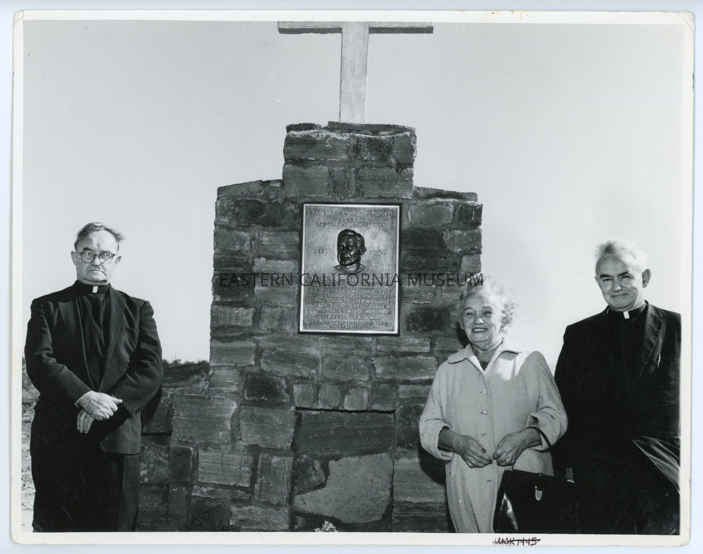 Old interpretative label: Monument at Padre Crowley Point on the Lone Pine-Death Valley Highway. Inscription: "From the snowy heights of the Sierras beyond the deep shadows of Death Valley. Beloved and trusted by people of all faiths. He lead them to life's wider horizons. He passed this way." Left to right: Father Fred Crowley, Mrs. Elmer Hansen (Nora Crowley), and Father George Crowley S.J. Brothers and sister of Father John J. Crowley.Collection